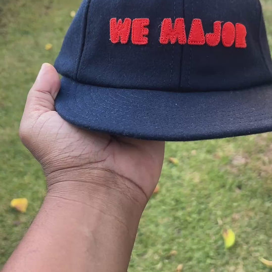 Navy blue wool ball cap with orange felt WE MAJOR print with a foldable brim. This cap is perfect for the cool weather and perfect for any outdoor adventure.